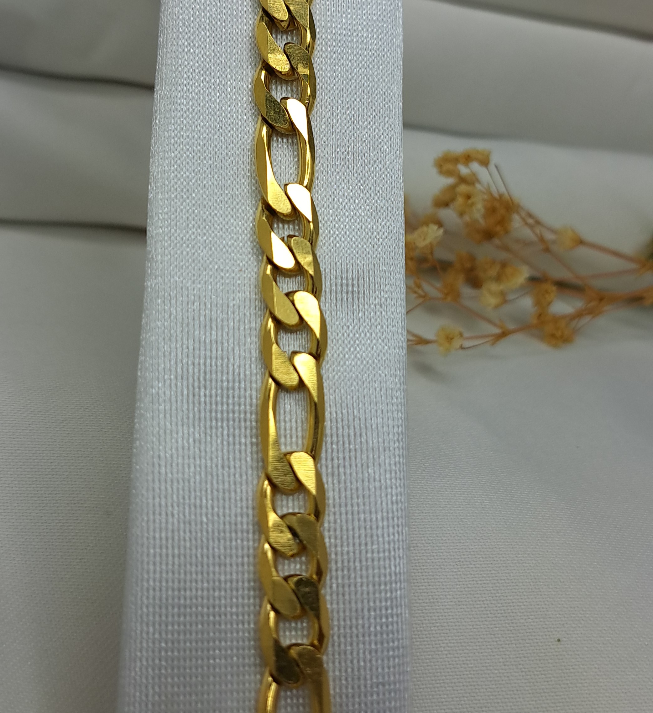 İncelikle işlenmiş altın renkli zincirler ve dayanıklı çelik malzemeden üretilen bileklik, üstün bir kaliteye sahiptir. Zaman içinde solmayan altın rengi, her zaman ışıltılı ve çekici bir görünüm sunar. Zincirlerin etkileyici kalınlığı, bilekliğin görünümünü daha da gösterişli hale getirir.