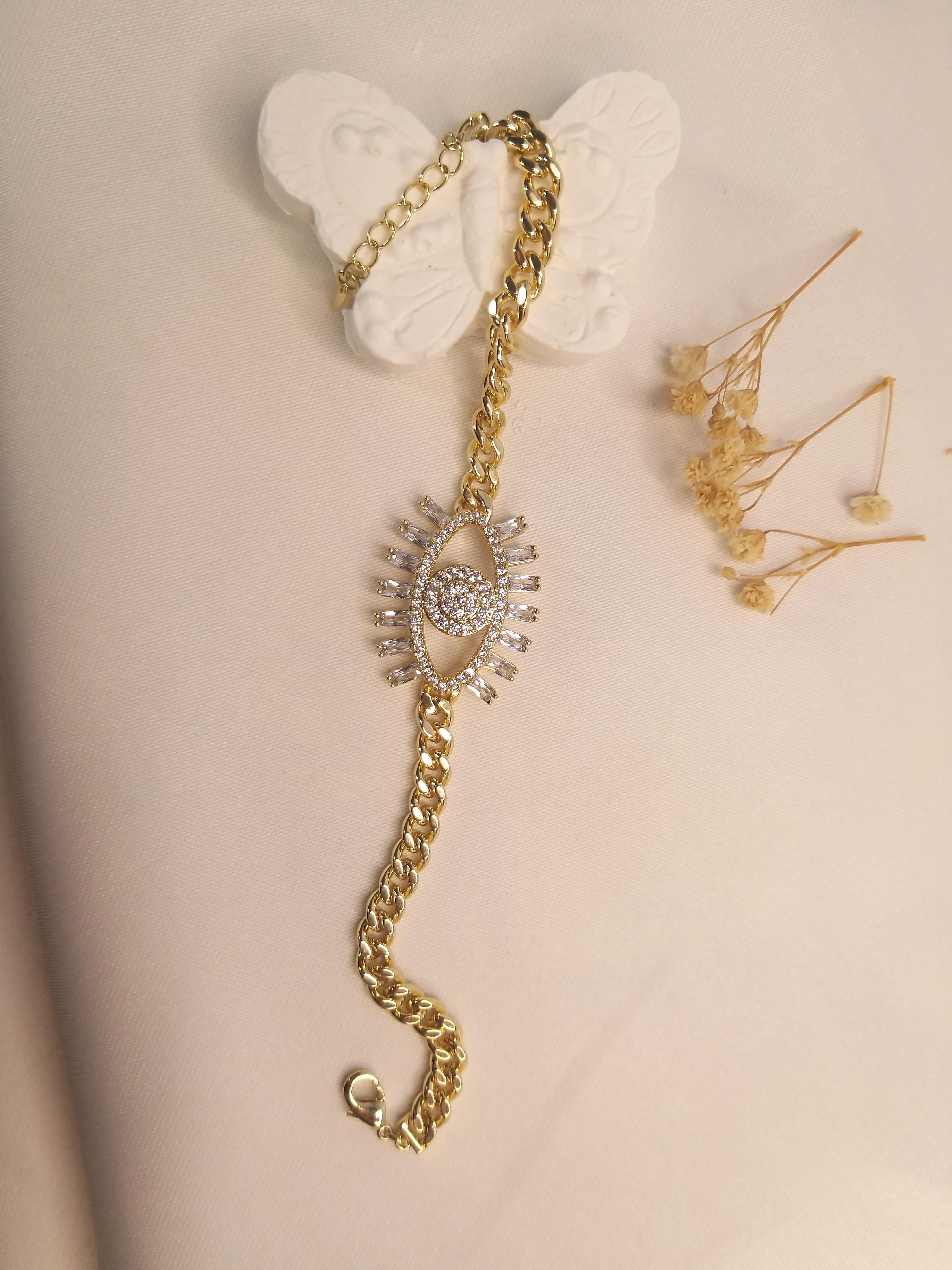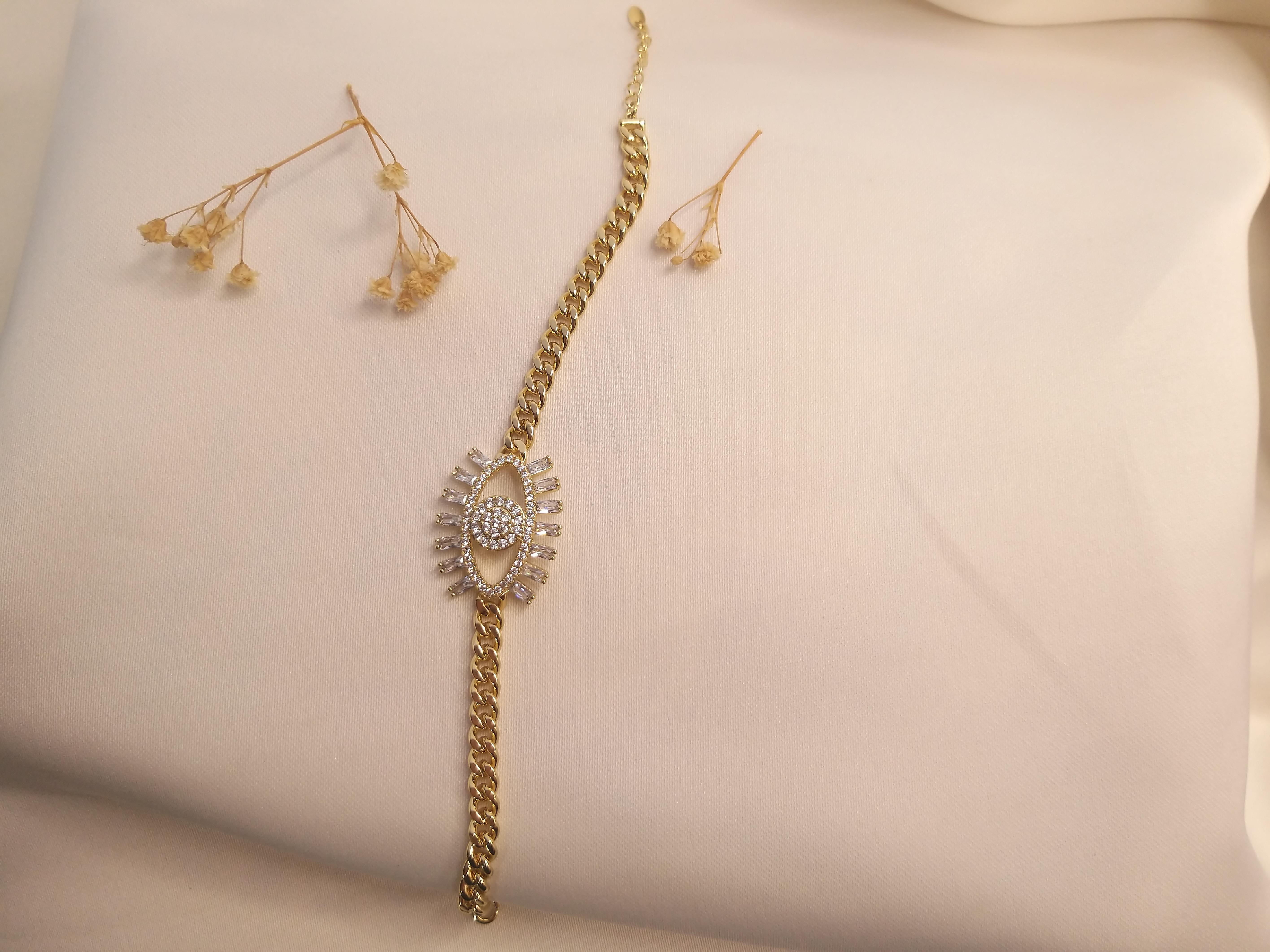 GÖZ TAŞLI GOLD BİLEKLİK, Türk kültürünün zengin ve çarpıcı bir simgesi olan göz taşlarıyla bezeli, şık ve göz alıcı bir bileklik. Bu eşsiz bileklik, zarafeti ve güzelliğiyle her kadının gardırobunda olması gereken bir parça.