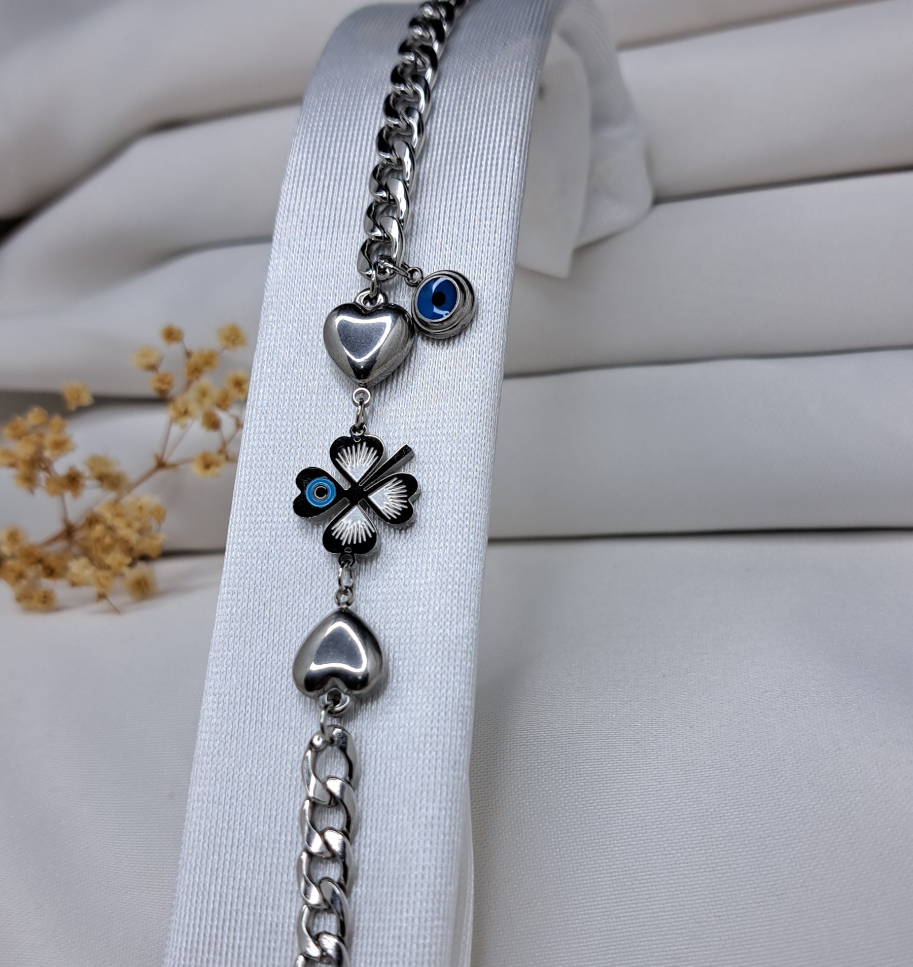KALPLİ YONCA MODEL SILVER ÇELİK BİLEKLİK, zarif bir tasarıma sahiptir ve kullanıcıların bileklerinde oldukça şık bir görünüm yaratır. Kalpli yonca figürü, bu bilekliği özel kılar ve takan kişilere şans getirdiği düşünülür.