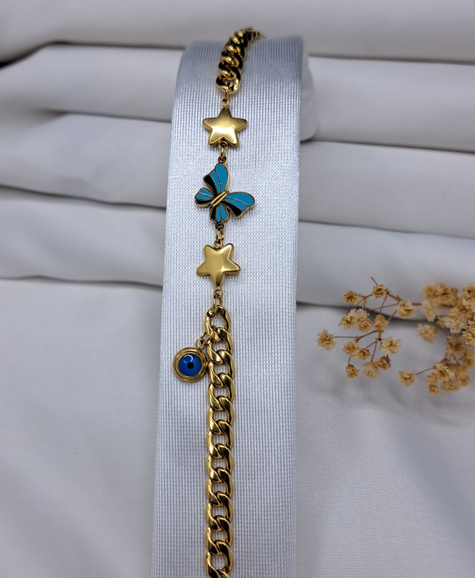 Mavi Kelebekli Yıldız Detaylı Şans Bilekliği, zarafet ve şansı bir araya getiren özel bir üründür. Bu bileklik, sade ve sofistike tasarımıyla dikkat çekerken, farklı renklerdeki mavi kelebek ve yıldız detaylarıyla da şans ve güç sembollerini yansıtmaktadır.