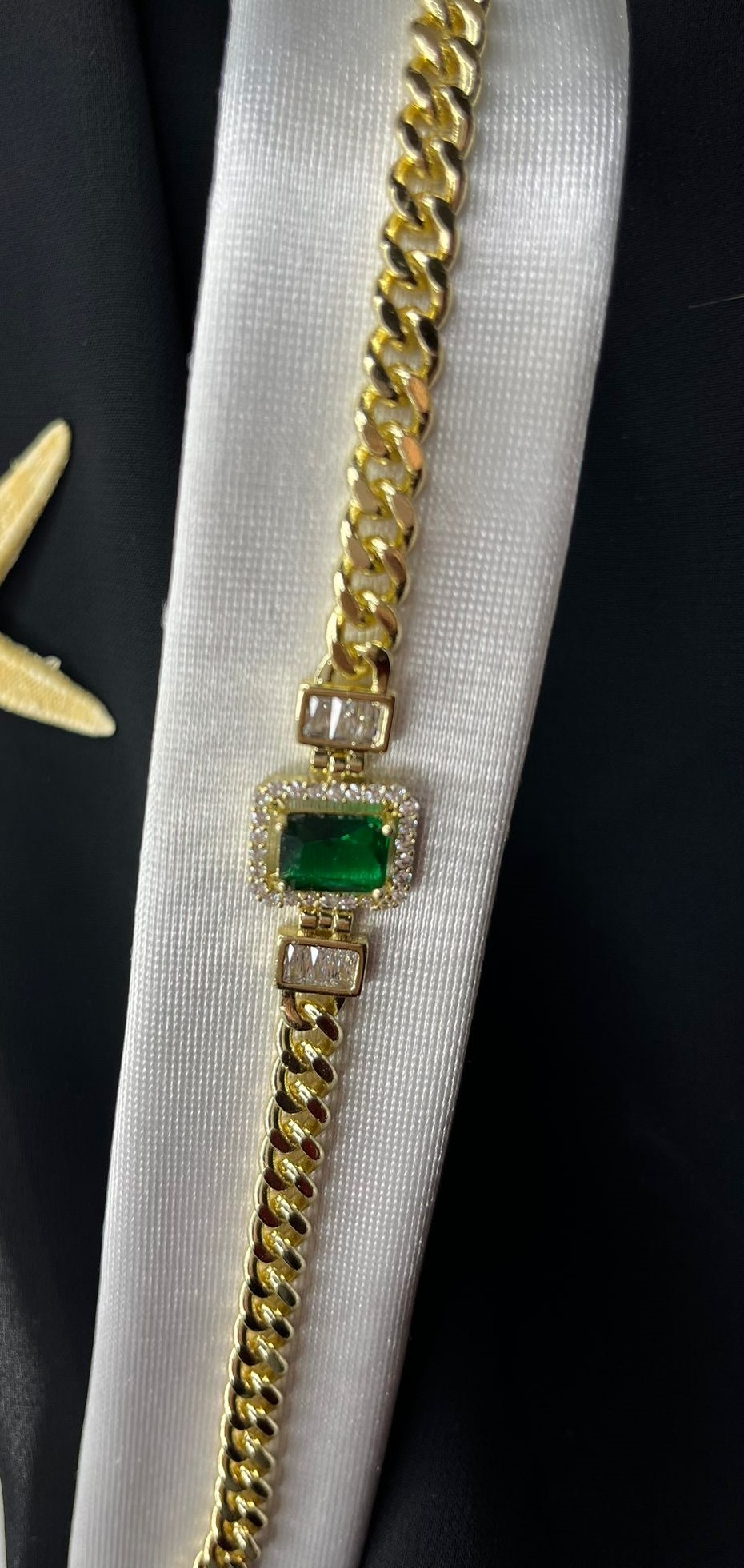 Birinci sınıf malzemelerden üretilmiş, eşsiz tasarımı ve zarif görünümü ile Yeşil Baget Taşlı Vip Bileklik, zarafeti seven kadınların vazgeçilmezi olmaya aday. Bu beyaz altın kaplamalı bileklik, üstün kaliteli malzemelerden özenle hazırlanmıştır ve el işçiliği ile detaylandırılmıştır.