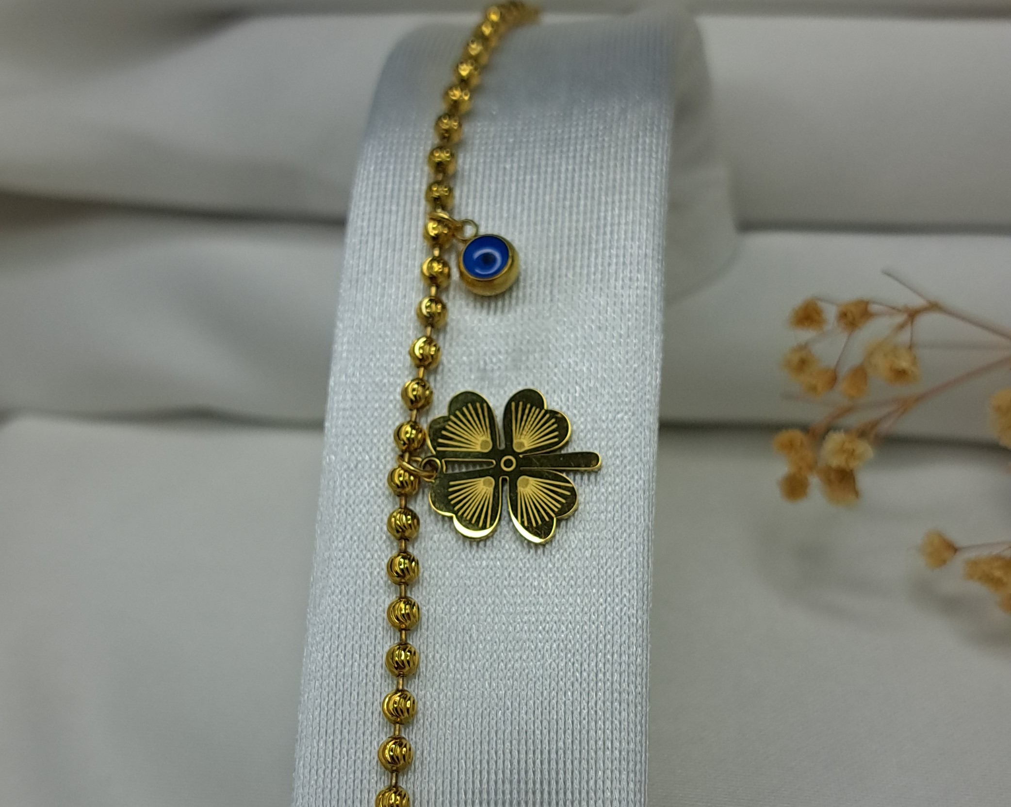 Yonca ve Nazar Boncuklu Şans Bilekliği, Türk kültüründe çok önemli bir yere sahip olan nazar boncukları ile şans, bereket ve koruma gibi anlamları bir arada buluşturan özel bir üründür. Doğadan esinlenerek tasarlanmış bu şık bileklik, herkesin dikkatini çekecek özel bir görünüme sahiptir.